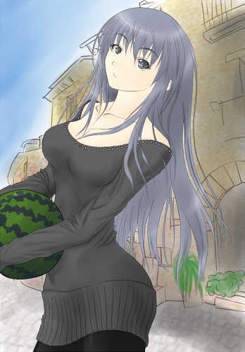 スイカを一回抱えなおすように身体を跳ねさせて、小首を傾げる。